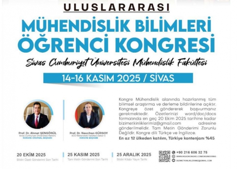 gerçekleştirilecek olan "Uluslararası Mühendislik Bilimleri Öğrenci Kongresi" tüm mühendislik